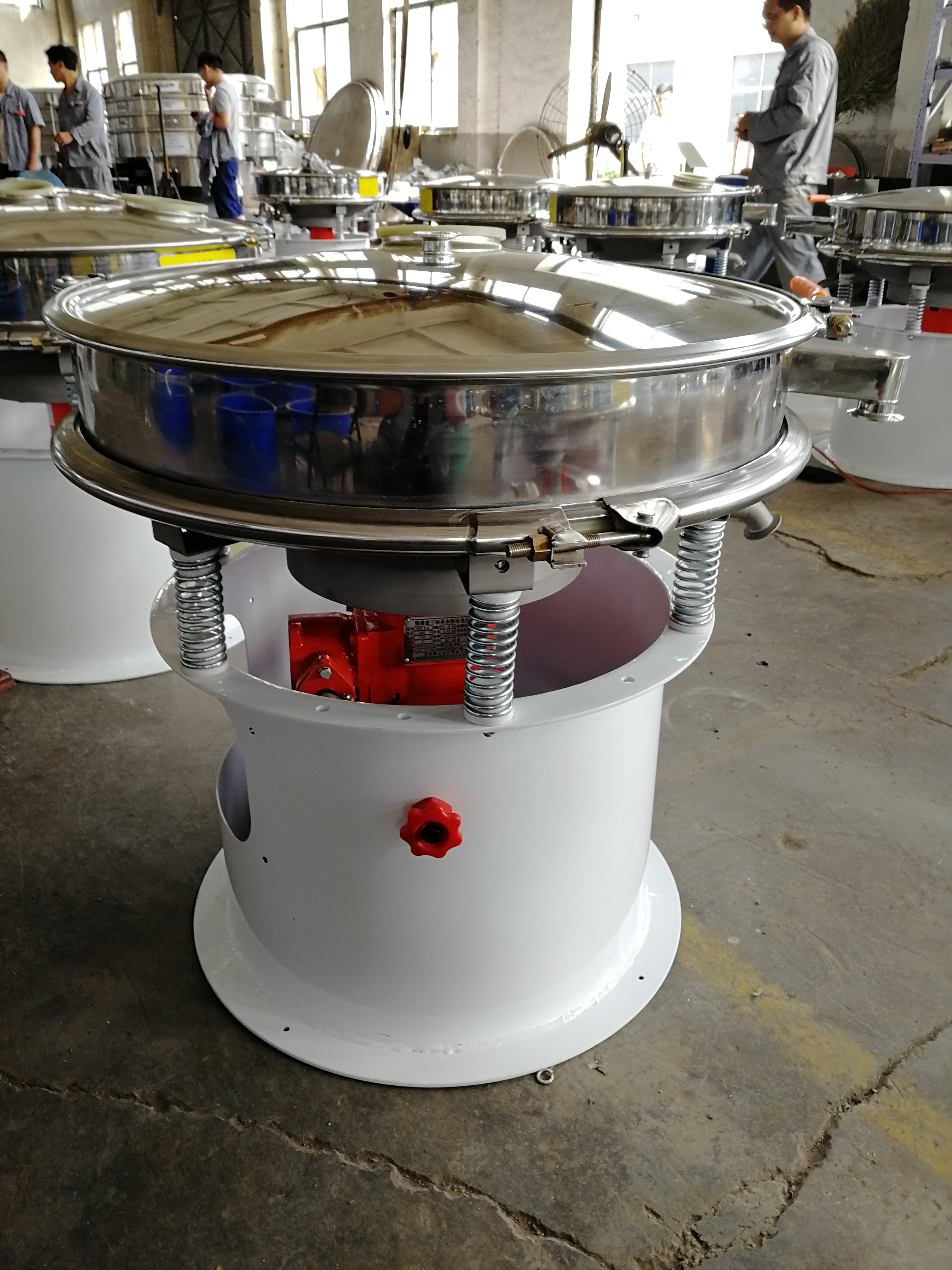 800型振動(dòng)篩普鋼跟不銹鋼差多少錢(qián)? 800型振動(dòng)篩普鋼跟不銹鋼差多少錢(qián)? 普鋼800型振動(dòng)篩即可單層粉末除雜、也可多層粒度分級(jí)、也可固液分離過(guò)濾使用,根據(jù)自己需要定制層數(shù)即可(可分層自由組合拆裝),是性?xún)r(jià)比高、一機(jī)多用的通用篩選設(shè)備。其噪音低、效率高,快速換網(wǎng)需3-5分鐘,全封閉結(jié)構(gòu),適用于粒、粉、粘液等物料的篩分和過(guò)濾。旋振篩是由直立式振動(dòng)電機(jī)做激振源,電機(jī)上、下兩端安裝有偏心重錘,將電機(jī)的旋轉(zhuǎn)運(yùn)動(dòng)轉(zhuǎn)變?yōu)樗健⒋怪薄A斜的三次元運(yùn)動(dòng),再通過(guò)彈簧的減震助振作用把這個(gè)三次元運(yùn)動(dòng)傳遞給篩面,